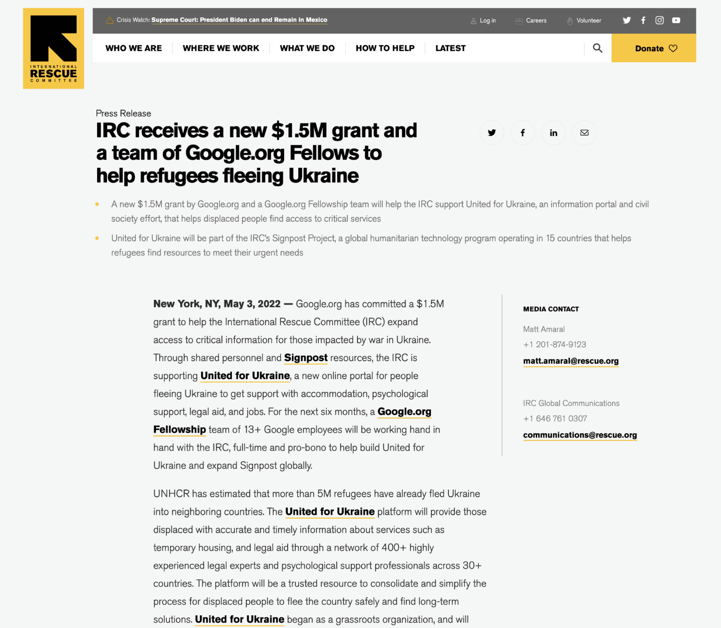 In the face of this humanitarian catastrophe, Google.org committed a $1.5 million grant and deployed a Fellowship team to support the International Rescue Committee (IRC). I volunteered and was selected to serve as the UX Lead for this initiative. My mandate was to partner with the IRC and a local NGO—United for Ukraine (UFU)—to design a humanitarian response platform for millions of displaced people.